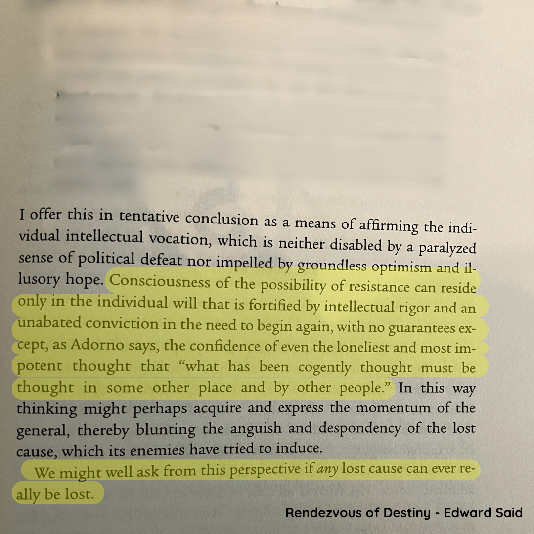 “How does the cause of a people, a culture, or an individual become hopeless? We had once believed as a people that there was room for us at the rendezvous of destiny,” Said writes wistfully. And yet, can a cause truly be lost? Said concludes it is the “intransigence of the individual thinker” within whom lies the “power of expression” that signals a hope for liberation as long as defiance exists.