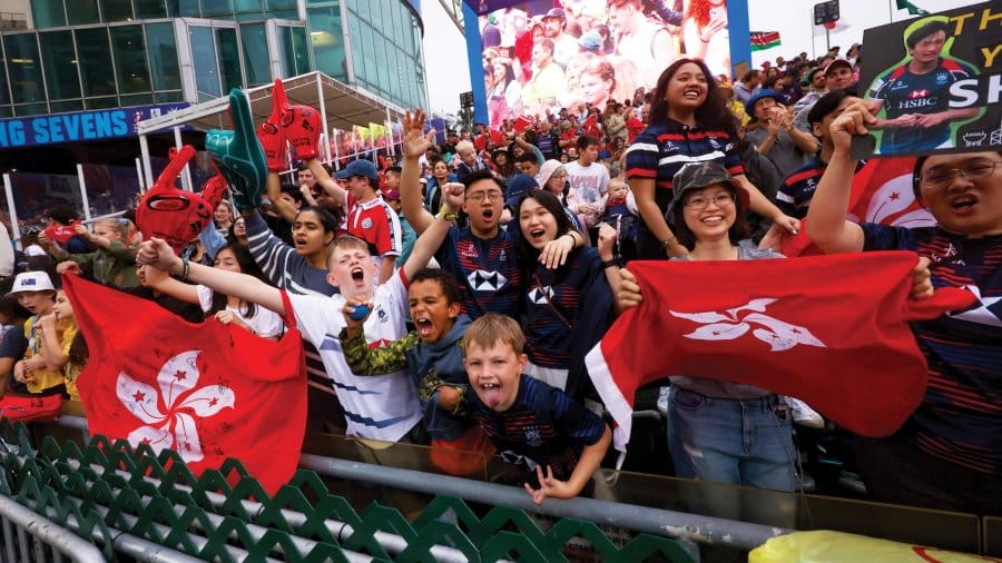 Fans cheer as they watch a match at the Hong Kong Stadium on the second day of the rugby sevens tournament on April 1, 2023. The event attracted about 75,000 spectators. (CALVIN NG / CHINA DAILY)