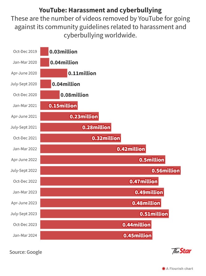 For YouTube, the number of videos removed for harassment and cyberbullying globally had spiked in the past three years.