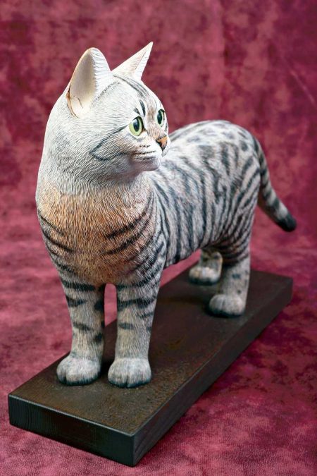 For statues of brown cats, lines in scorched colors created with a wood burning pen are sufficient to depict their fur. However, when making statues of white, black or patterned cats, he also uses acrylic paints in the respective colors.