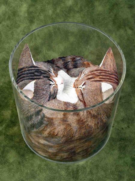 One cat statue stares intently as if pleading for something. Another one amusingly fits into a narrow box by curling up its elastic body. A third cat looks surprised with its mouth wide open. Looking closely at Nishi’s works, you cannot help but smile at the intricate depictions of their behaviors and expressions.