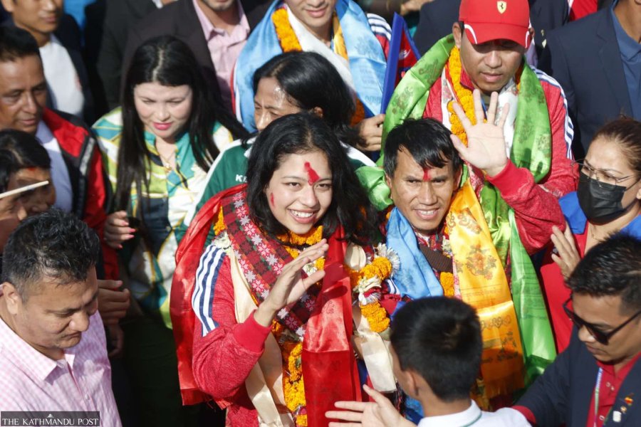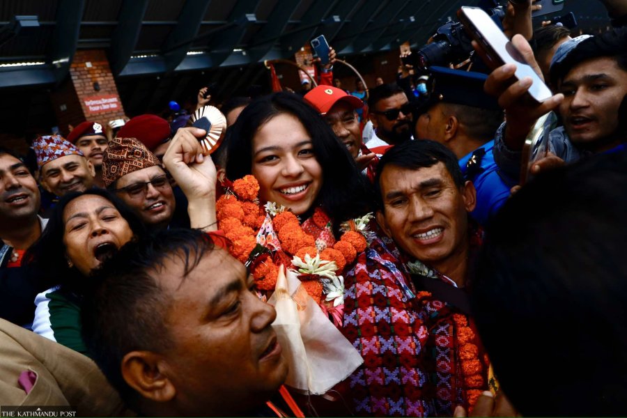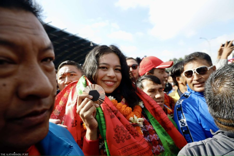 She arrived with the Nepali para taekwondo team in Nepal on Wednesday and was greeted with a grand welcome at Tribhuvan International Airport.